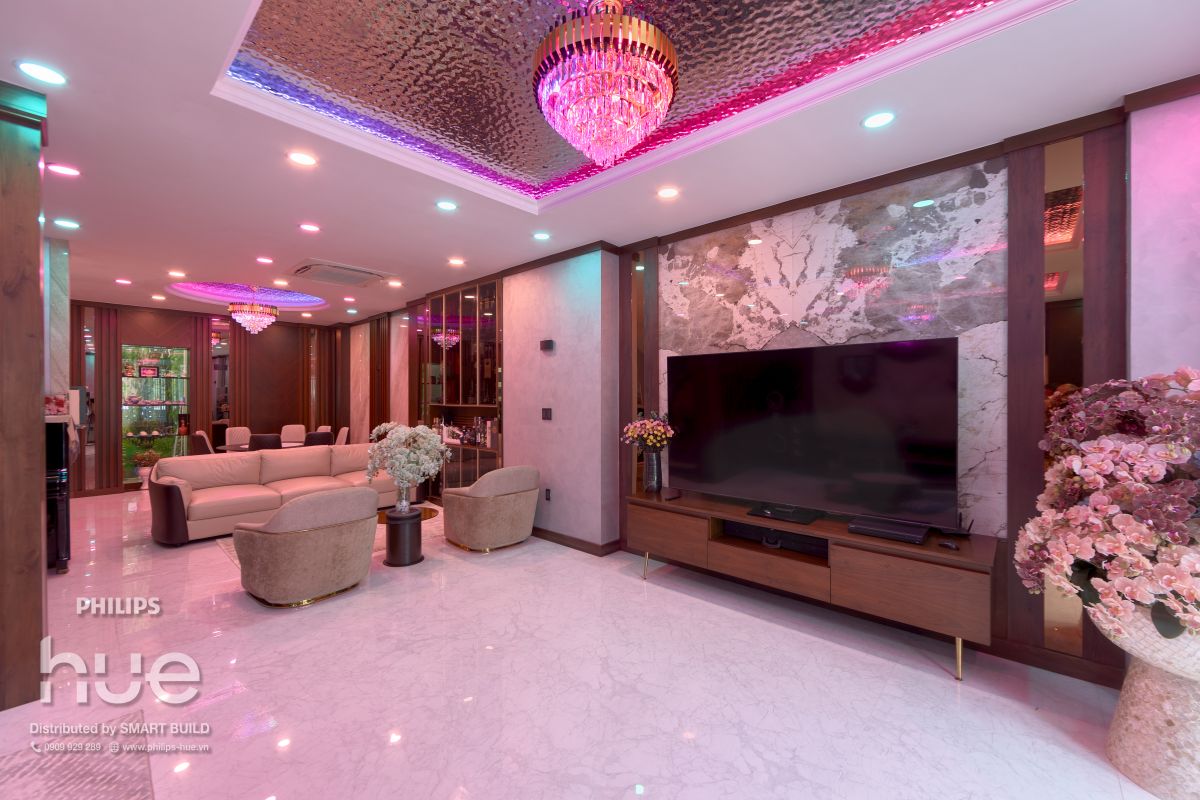Villa Madam Hiền: chiếu sáng thông minh Philips Hue, sống hiện đại và linh hoạt.Villa Madam Hiền tọa lạc tại quận Bình Tân, TP. Hồ Chí Minh, khu vực đang phát triển mạnh về hạ tầng đô thị và các khu dân cư hiện đại. Công trình được thiết kế theo phong cách kiến trúc hiện đại, với các đường nét tối giản, không gian mở và sự kết hợp hài hòa giữa ánh sáng tự nhiên và hệ thống chiếu sáng nhân tạo. Với diện tích xây dựng rộng và nhiều khu vực chức năng như phòng khách, phòng bếp, phòng ngủ, khu sinh hoạt chung và không gian ngoại thất, hệ thống chiếu sáng đóng vai trò quan trọng trong việc tạo nên sự kết nối giữa các không gian trong nhà. Thay vì sử dụng hệ thống đèn truyền thống, gia chủ đã lựa chọn giải pháp chiếu sáng thông minh Philips Hue nhằm mang lại sự linh hoạt trong việc điều chỉnh ánh sáng, đồng thời nâng cao trải nghiệm sống hàng ngày. Toàn bộ hệ thống được Smart Build tư vấn, cung cấp và triển khai, đảm bảo tính đồng bộ giữa thiết kế chiếu sáng, công nghệ và vận hành thực tế.